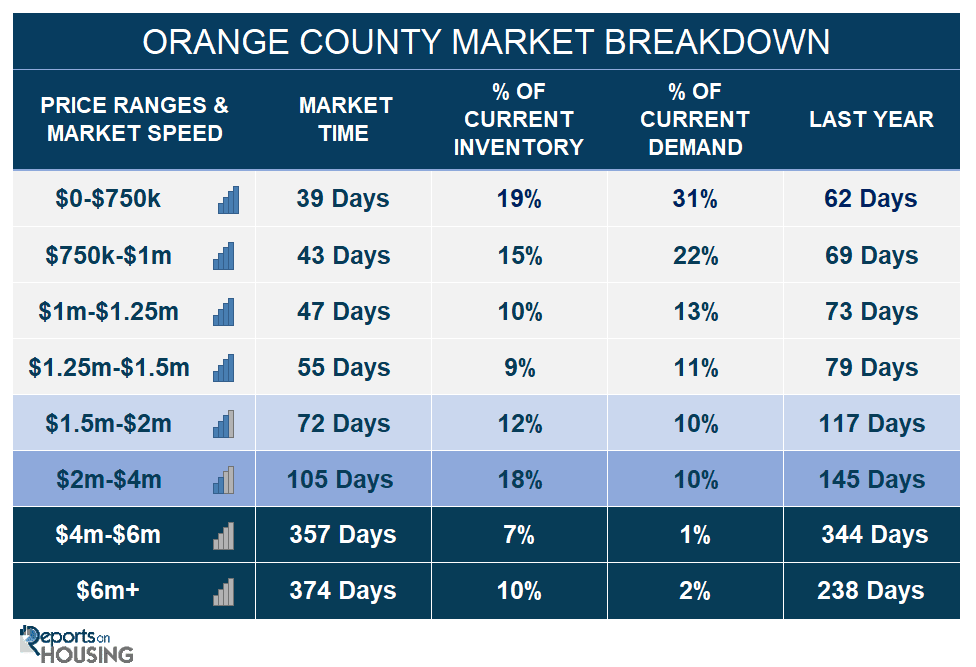 With demand plunging compared to the drop in supply, the Expected Market Time (the number of days to sell all Orange County listings at the current buying pace) increased from 59 to 62 days in the past couple of weeks. Last year, the Expected Market Time was 84 days, slower than today. The 3-year average before COVID was 104 days, much slower than today.