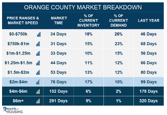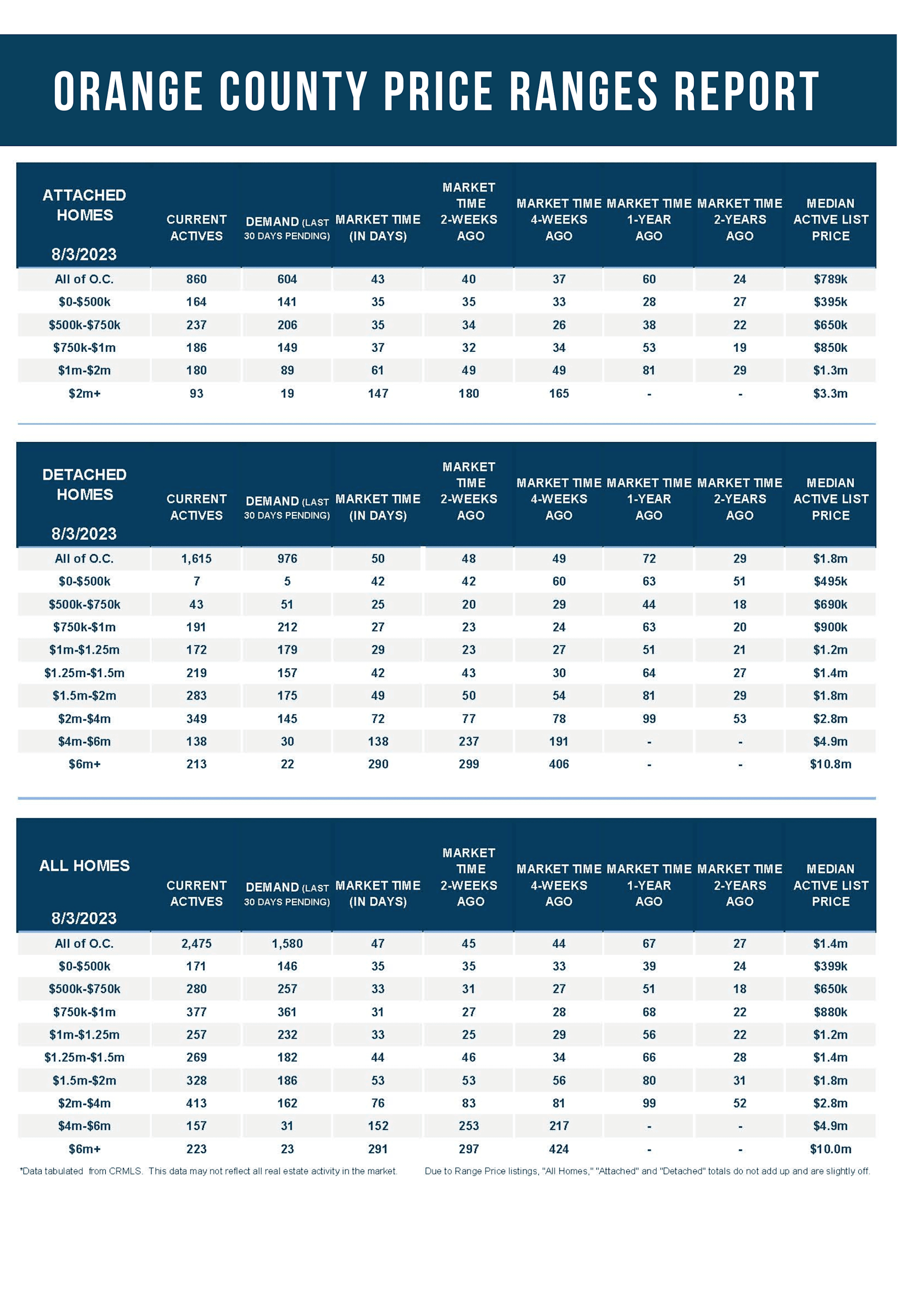 In the past couple of weeks, the luxury inventory of homes priced above $2 million decreased from 815 to 793 homes, 22 fewer, down 3. Luxury demand increased by 17 pending sales, up 9%, and now sits at 216, its highest level since June. With supply dropping and demand rising, the Expected Market Time for luxury homes priced above $2 million decreased substantially from 123 to 110 days, its strongest reading since June. Luxury is still much slower than the lower ranges, necessitating a careful approach to pricing to secure success.
