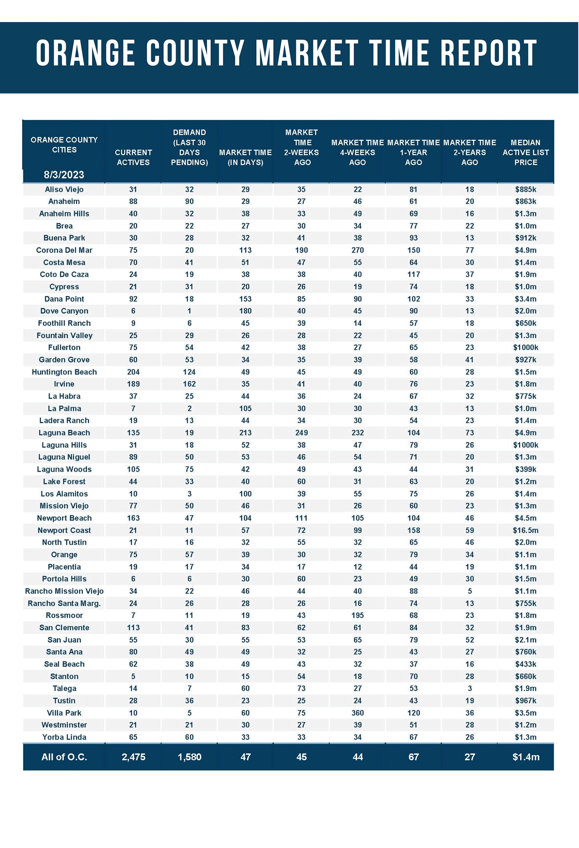 With supply rising and demand falling, the Expected Market Time (the number of days to sell all Orange County listings at the current buying pace) increased from 45 to 47 days in the past couple of weeks. Last year the Expected Market Time was 67 days, much slower than today. The 3-year average before COVID was 78 days, significantly slower than today.