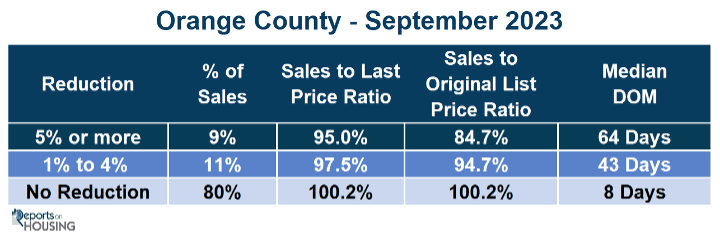 For homes that reduced their asking prices by 5% or more, a surprising 9% of closed sales in September, the sales-to-last list price ratio was 95.0% after being on the market for over two months. A home that finally reduced its price to $1 million sold for $950,000. Everybody would agree that closing at $1,002,000 is much better than $950,000, a mind-blowing $52,000 better.