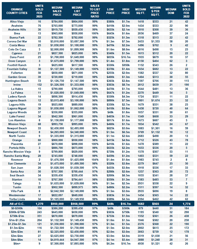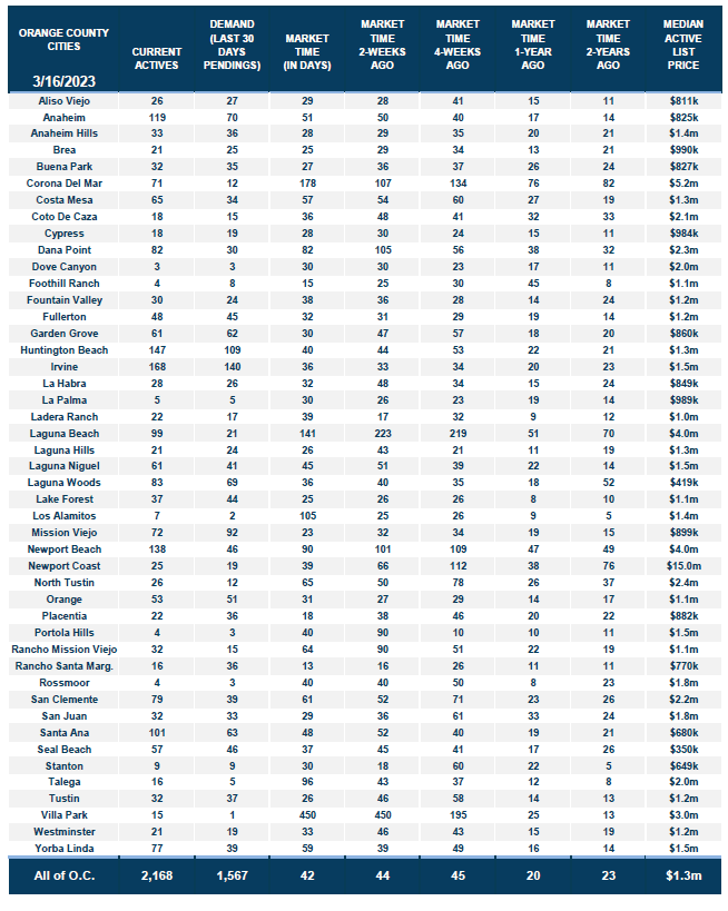At 42 days, Orange County buyers are once again experiencing long lines of buyers at open houses, multiple offer situations, and sales prices above the asking price. This is not due to heightened demand. High mortgage rates are inhibiting demand. Instead, it is a result of not enough new sellers and a muted inventory. So far this year, in January through February, there have been 2,793 missing FOR-SALE signs compared to the 3-year average before COVID (2017 to 2019), down 45%. Today’s buyers cannot buy want is not for sale, so buyers in today’s marketplace are waiting for homes to be placed on the market. As soon as a home becomes available, if it is in decent shape and priced right, it will be greeted with plenty of buyer traffic and interest.