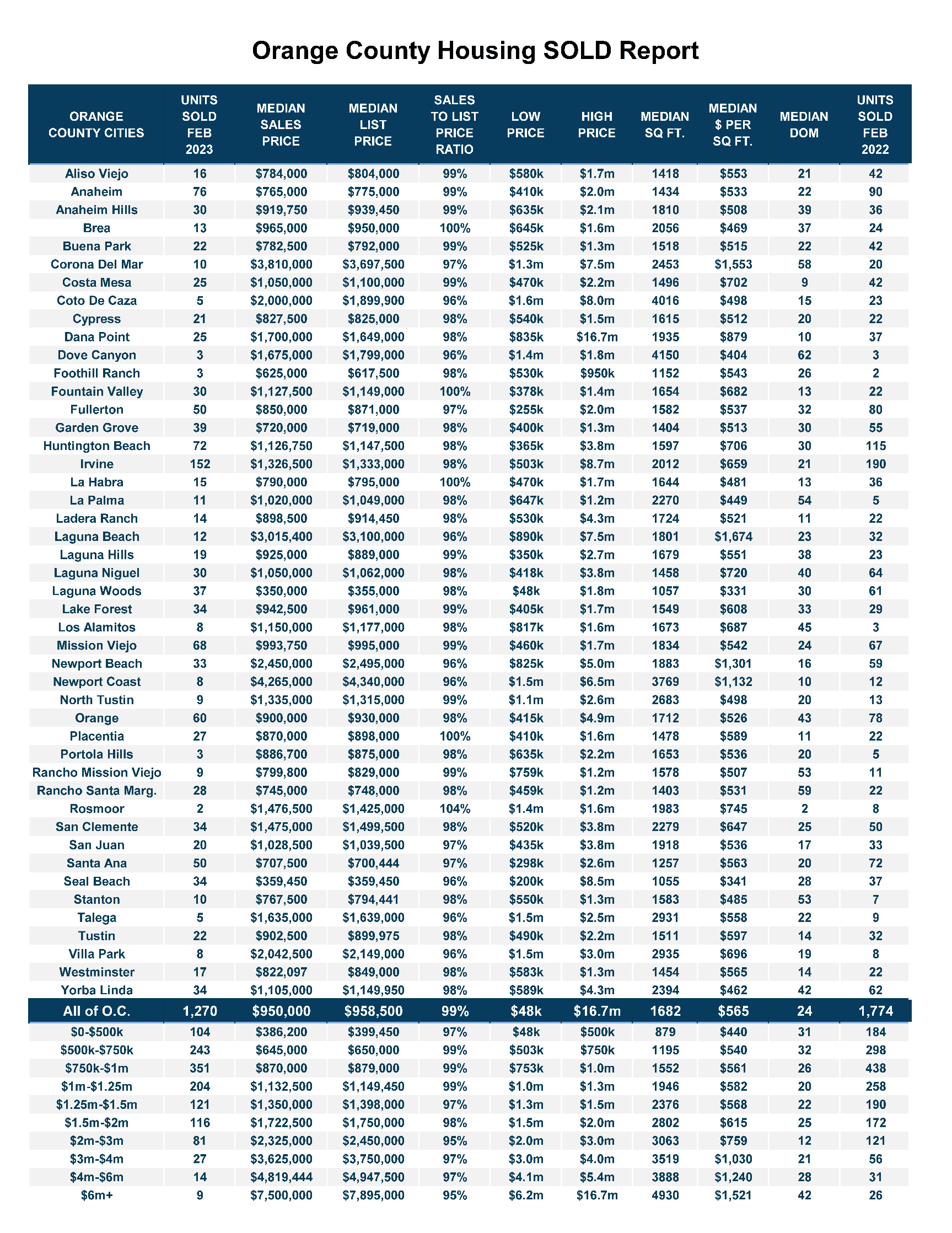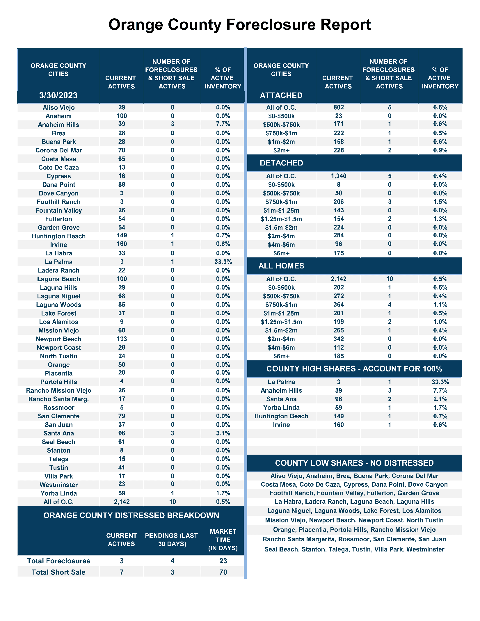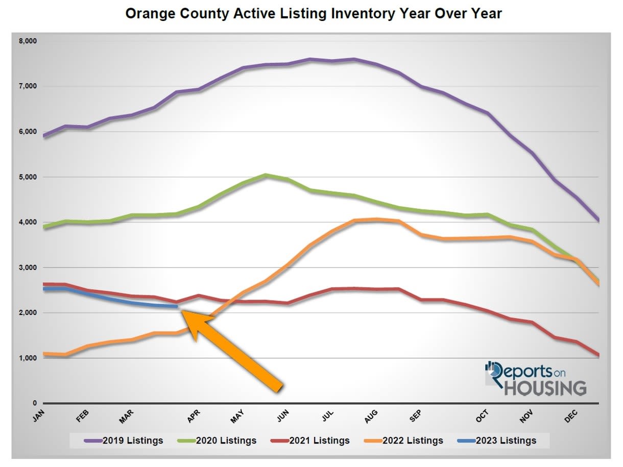 The high mortgage rate environment affected both supply and demand. Naturally, everyone anticipated that high rates would enormously impact affordability and weaken buyer demand. Yet, very few anticipated that high rates would inhibit so many homeowners from listing their homes for sale. During the first three months of 2023 in Orange County, 45% fewer homes were placed on the market, or 4,538 missing sellers. Homeowners are staying put and “hunkering down” because of their locked-in, low, monthly fixed mortgage payment. As a result, the inventory has dwindled, and the housing market has heated up substantially since January. The inventory has dropped from 2,530 in January to 2,142 today, a 15% drop. The 3-year average before COVID (2017 to 2019) was an increase of 15%, from 4,665 to 5,533.