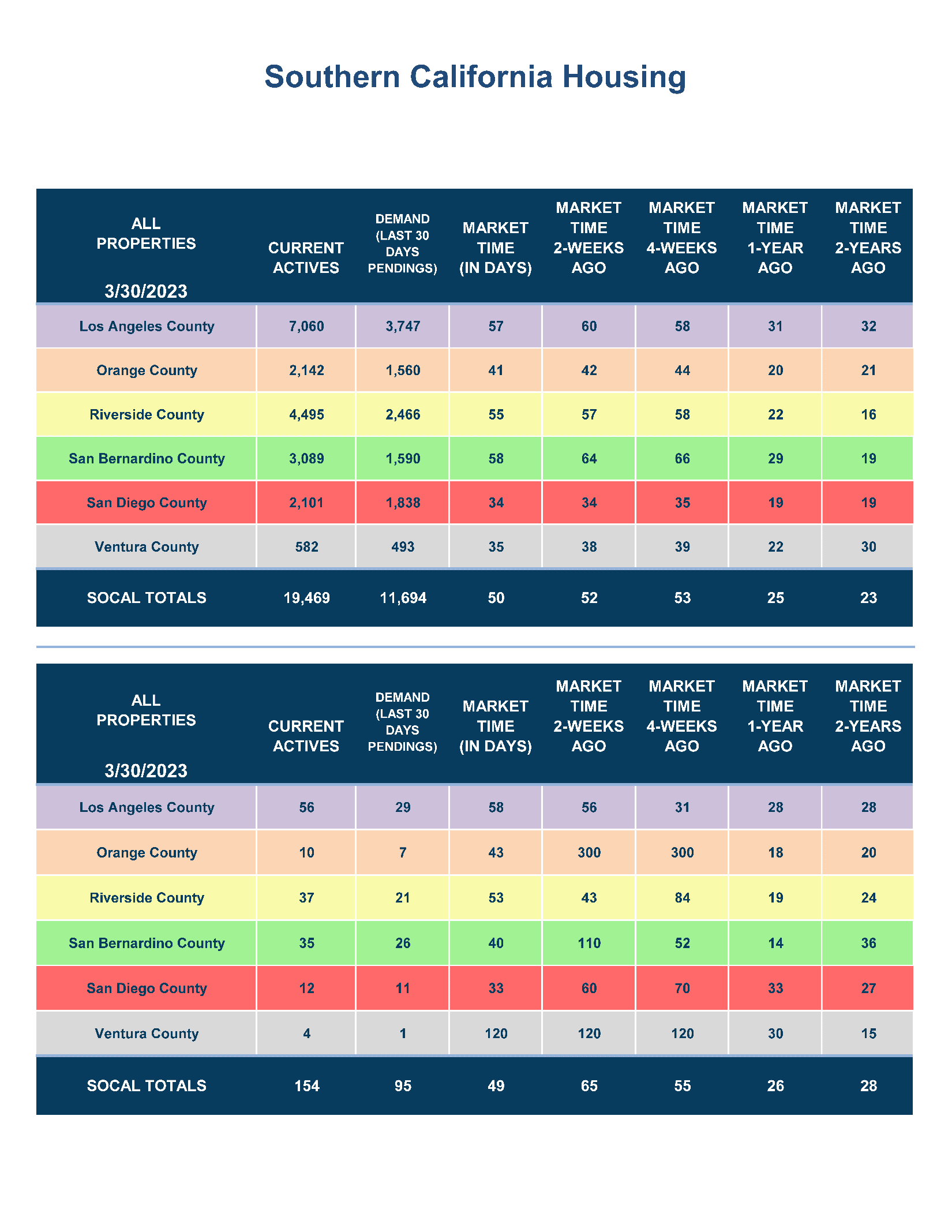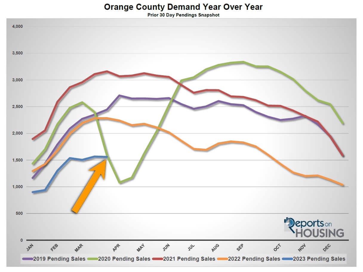 Homeowners continue to “hunker down” in their homes, unwilling to move due to their current underlying, locked-in, low fixed-rate mortgage. The difference between their underlying rate and today’s prevailing rate is significant and precludes many homeowners from listing their homes for sale and moving to another house. This will continue until mortgage rates drop. For March, 2,143 new sellers entered the market in Orange County, 1,346 fewer than the 3-year average before COVID (2017 to 2019), 39% less. These missing signs counter any potential rise in the inventory.