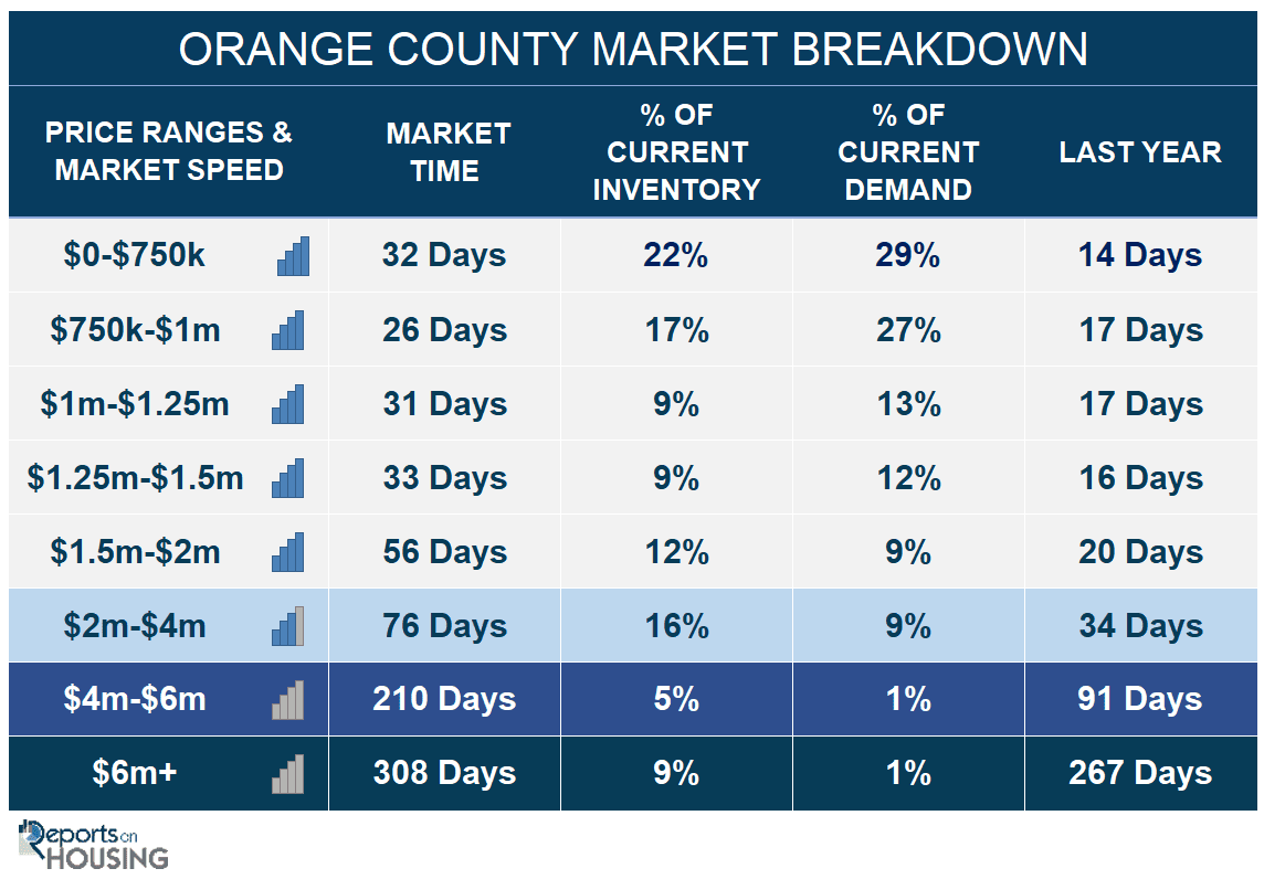 With a falling supply and unchanged demand, the Expected Market Time (the number of days to sell all Orange County listings at the current buying pace) decreased from 42 to 41 days in the past couple of weeks, its lowest level since May 2022. At 41 days, the market is hotter than the 84-day level to start the year, but this is more of a function of a lack of supply and not record-breaking demand. Last year the Expected Market Time was 20 days, substantially faster than today, and home values were screaming higher. The 3-year average before COVID was 63 days, a slower pace than today.