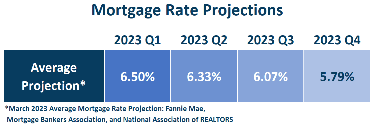 Mortgage rates predictably fall when the economy slows, especially during a recession. Investors look to park their money long-term with safe investments, government bonds, and mortgage-backed securities (bundled home loans). As more and more investors flood these long-term investments, their rate of return drops, and mortgage rates drop. According to the average projection from Fannie Mae, the Mortgage Bankers Association, and the National Association of REALTORS, mortgage rates are anticipated to drop to 6.33% during 2023 Q2, drop further to 6.07% during 2023 Q3, and then drop below 6% to 5.79% during 2023 Q4. While forecasting mortgage rates is exceptionally challenging, one thing is certain: the Federal Reserve has attempted to slam on the economy's brakes through a series of short-term Federal Funds rate hikes. Eventually, the economy will decelerate further and likely enter a recession, and 30-year mortgage rates will fall.