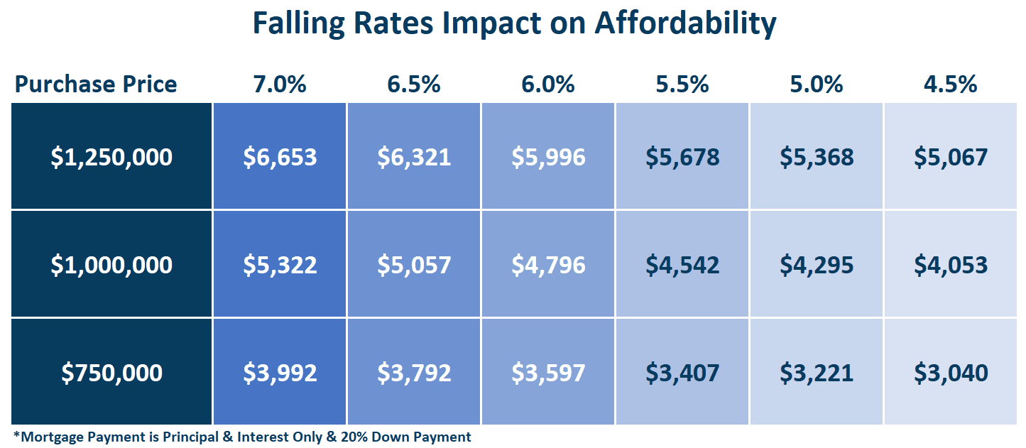 For a $1 million home with 20% down, the payment was at $5,322 just before the bank failures at the start of March when rates exceeded 7%. It dropped to around $5,057 today, slightly less than 6.5%, a savings of $265 per month, or $3,180 annually. At 6%, the $4,796 monthly payment becomes a monthly savings of $526, or $6,312 per year, compared to 7%. If rates plunge to 5.5%, the payment drops to $4,542, a monthly savings of $780, or $9,360 annually.