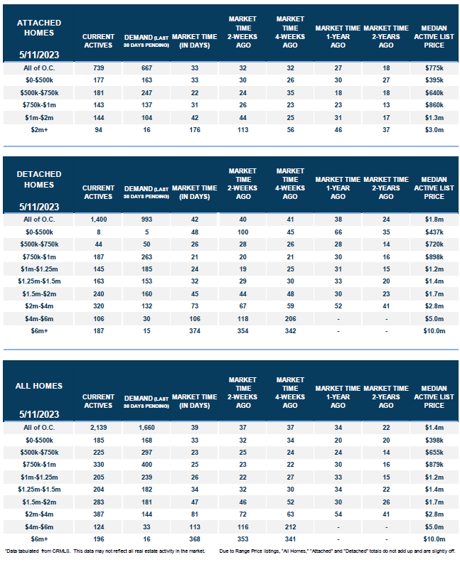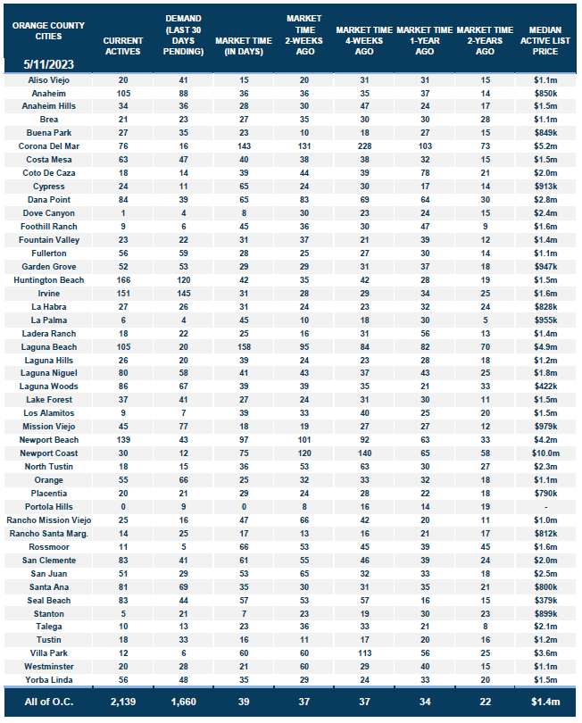 With supply rising and demand falling, the Expected Market Time (the number of days to sell all Orange County listings at the current buying pace) climbed from 37 to 39 days in the past couple of weeks. Last year the Expected Market Time was 34 days, slightly faster than today, yet it was cooling fast due to increasing rates. The 3-year average before COVID was 68 days, a slower pace than today.