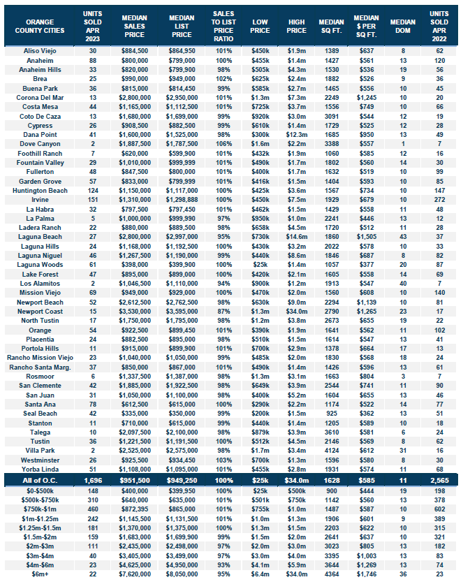 Homeowners continue to “hunker down” in their homes, unwilling to move due to their current underlying, locked-in, low fixed-rate mortgage. For April, 2,037 new sellers entered the market in Orange County, 1,983 fewer than the 3-year average before COVID (2017 to 2019), 49% less. These missing signs counter any potential rise in the inventory.