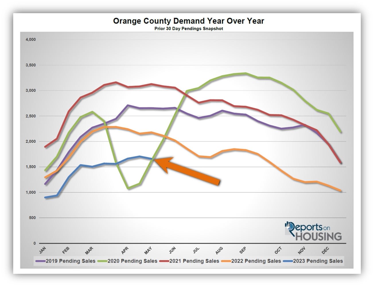 Last year, demand was at 2,179, 31% more than today, or an extra 519. The 3-year average before COVID (2017 to 2019) was 2,765 pending sales, 67% more than today, or an additional 1,105.