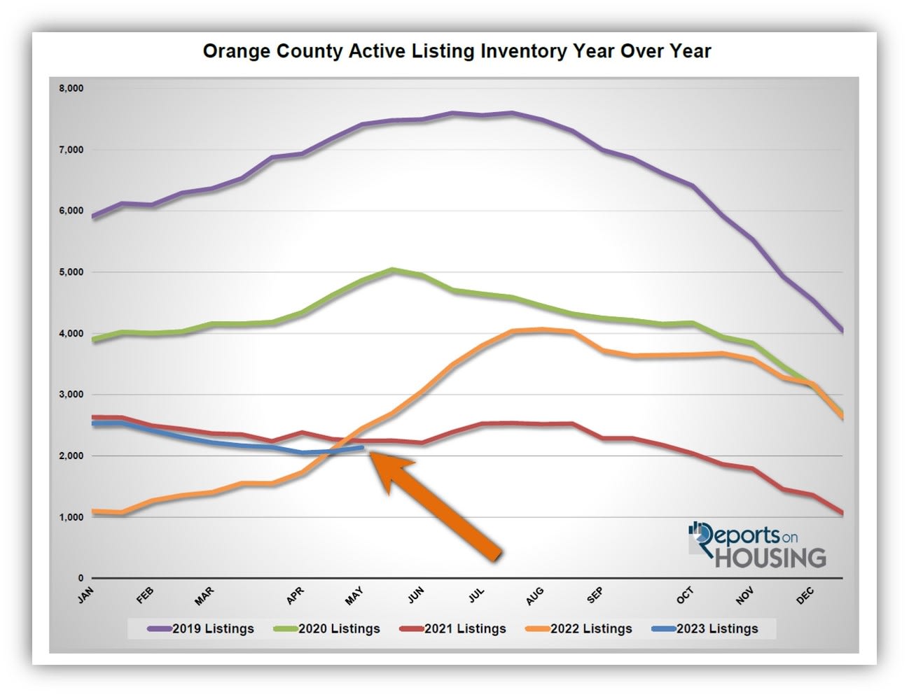 FACT – The active inventory in Orange County is at its lowest level in May since tracking began in 2004. Housing is experiencing a crisis, a catastrophically low level of available homes. During the Great Recession, a glut of homes was on the market. Today, the market suffers from the opposite condition: a minimal supply. For housing to tip in the buyer’s direction, the inventory needs to rise at the very least to pre-pandemic levels. The 5-year average peak from 2015 to 2019 was 7,058 homes. There are only 2,139 homes available today. Last year, the inventory grew substantially from April through August, peaking at 4,069 homes. It stopped climbing due to a lack of sellers coming on the market. The inventory is not poised to rise anywhere near 7,000 homes anytime soon