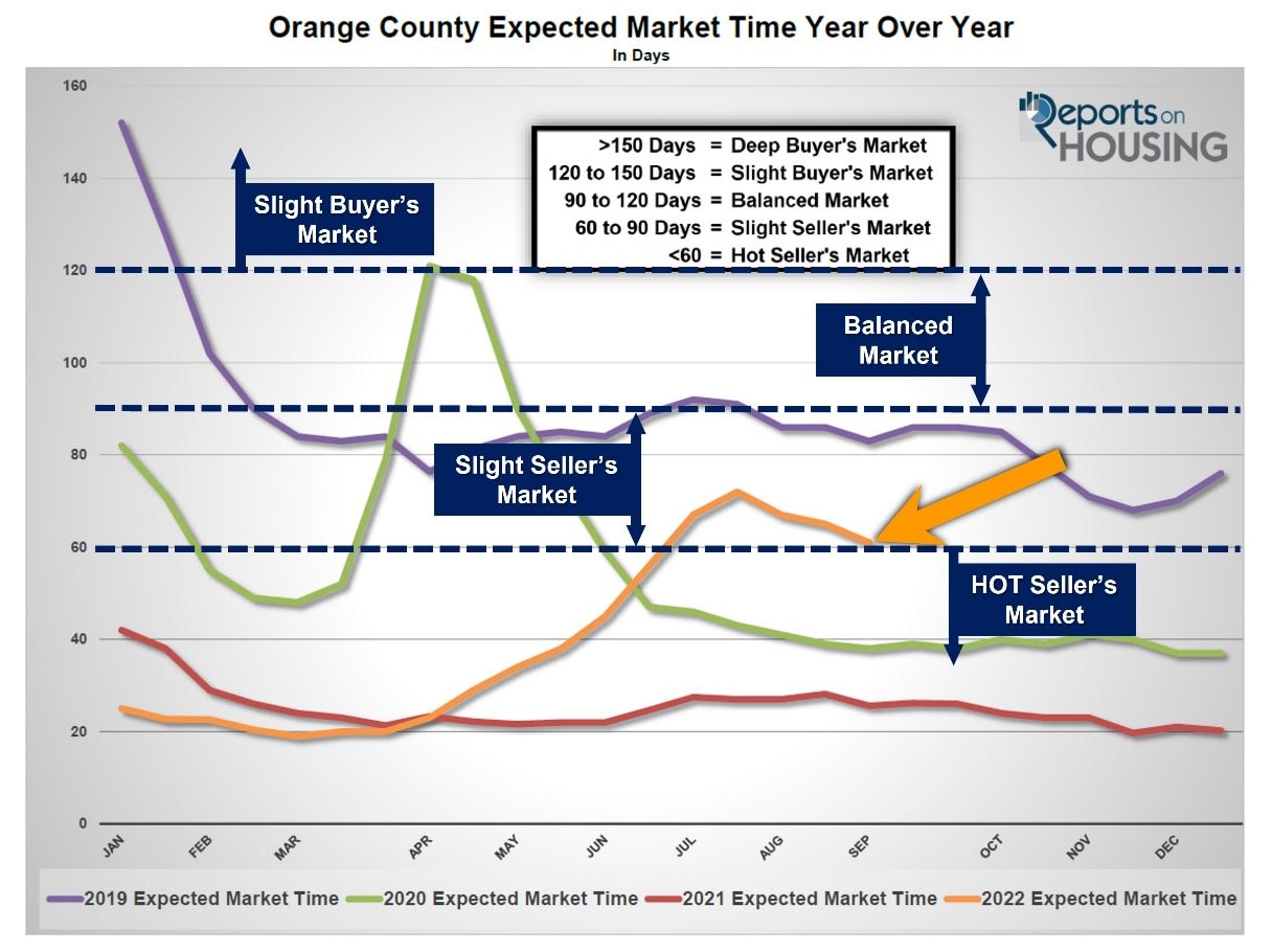 In pairing low supply with low demand, the Orange County housing market lines up slightly in favor of sellers. The Expected Market Time is at 61 days, a Slight Seller’s Market (between 60 and 90 days). It has actually improved since the end of July when it was at 72 days. Yet, it is much slower than the 19-day level reached at the beginning of March.