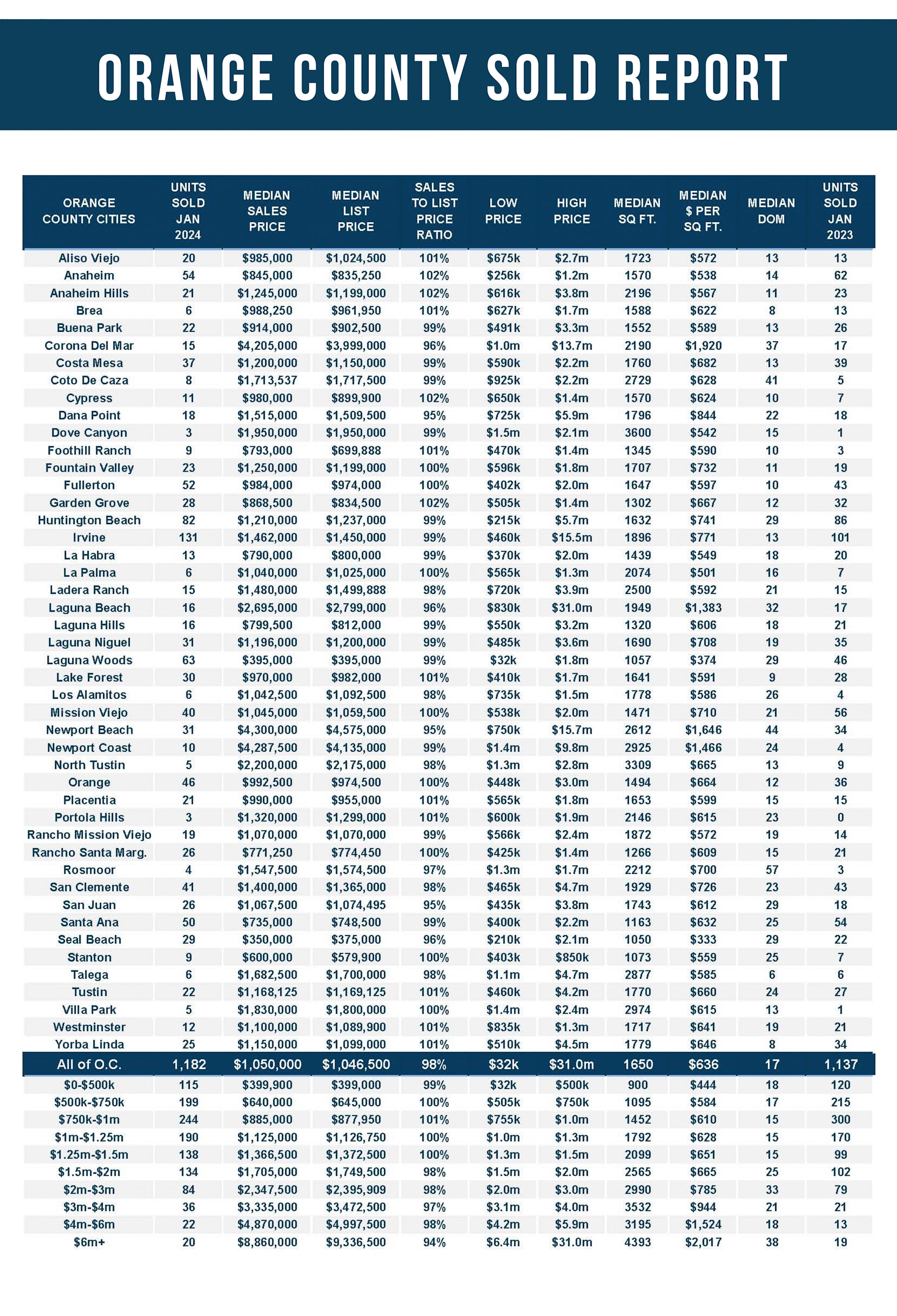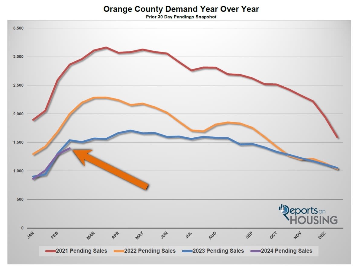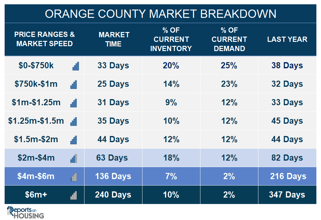 The Orange County housing market is particularly rate-sensitive. As rates slowly migrate higher, the market cools, limiting supply and demand. When rates eventually fall, demand will rise, more homeowners will sell, the housing market will speed up, and there will be a noticeable increase in closed sales.
